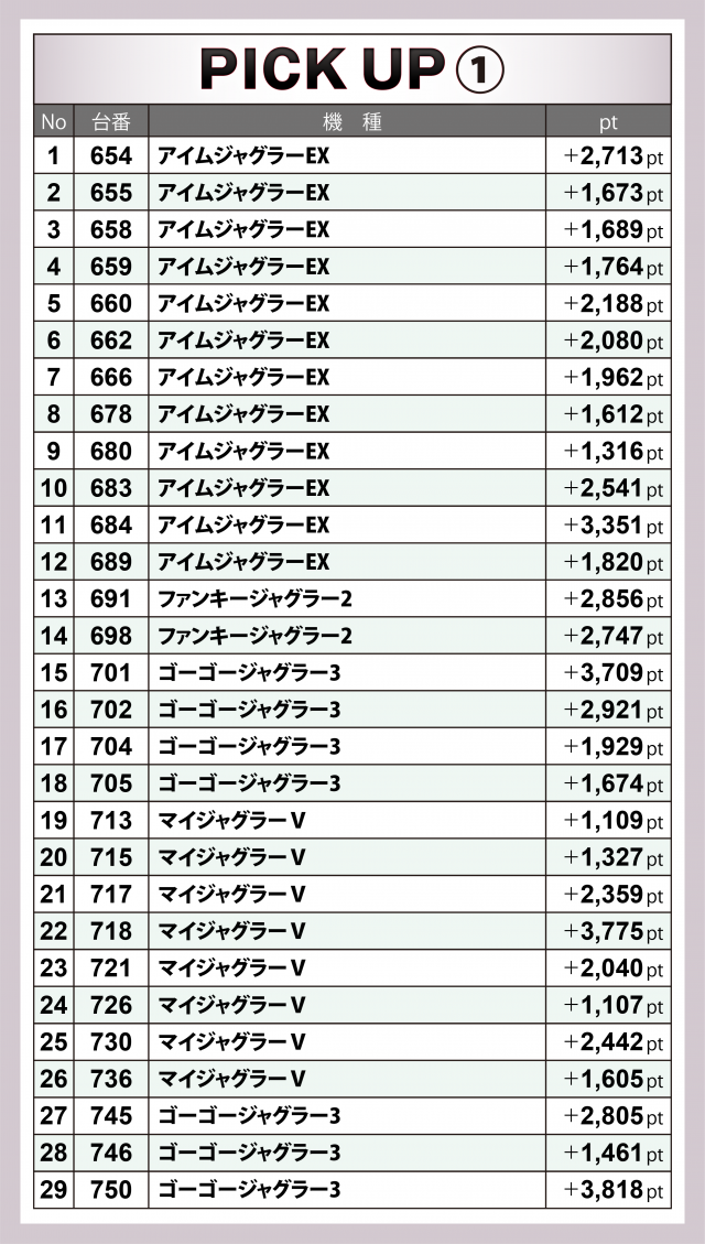 4機種が5割付近の勝率となり、『アイムジャグ』が最も多いプラス台を計上。一方、前回の様に+5千~+4千を超える台は見受けられなかったが+3千超が4台・+2千超が11台と、今回もクオリティの高さは健在だった。