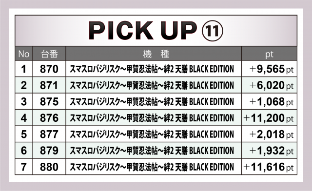特に『スマスロバジリスク~甲賀忍法帖~絆2 天膳 BLACK EDITION』には2台、『L戦国乙女4 戦乱に閃く炯眼の軍師』『パチスロ からくりサーカス』には1台ずつ、計4台の万枚オーバーが生じ、前回以上の好況を見せてくれた。『絆2』では他にも+9千6百弱・+6千超といった台もあり。