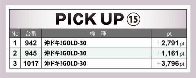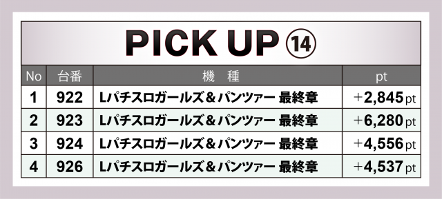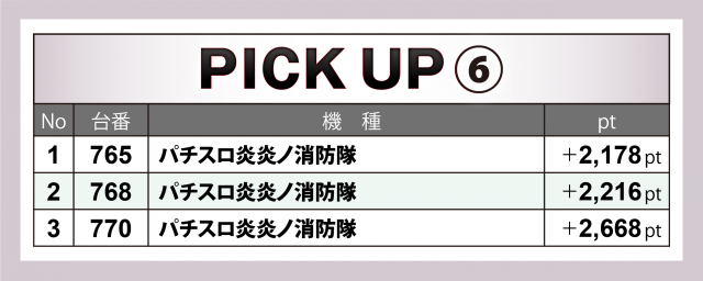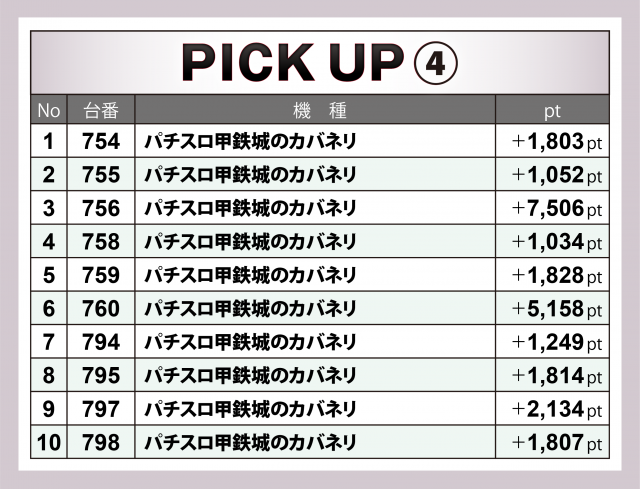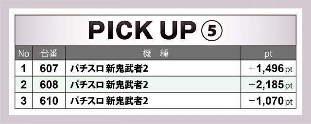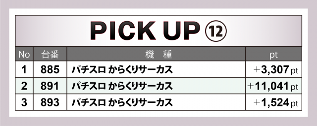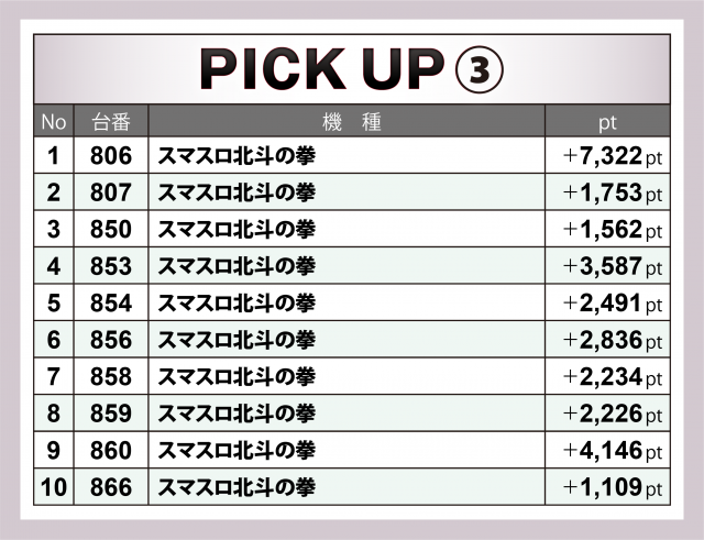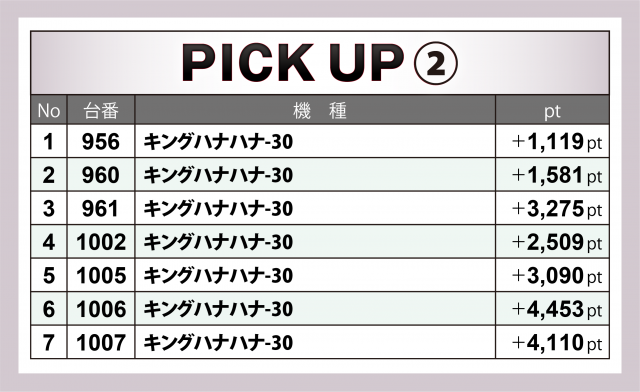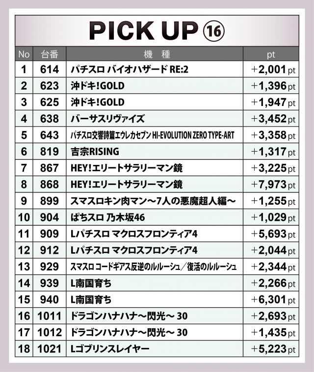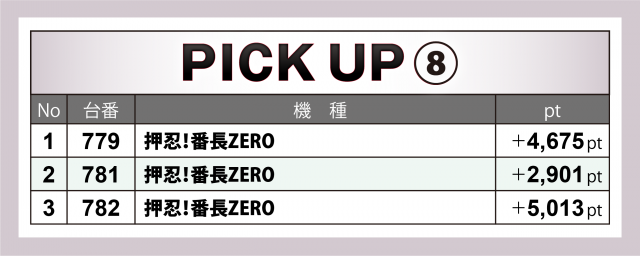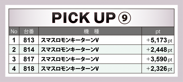 設置31台のうち半数超となる17台がプラスに成功、10台がプラス4桁を成し遂げた。806番台が+7千3百超でシマトップに輝いた他、+4千超×1・+3千超×1・+2千超×4と過去回に匹敵する好成績となった。