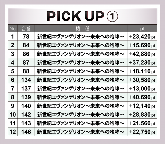この日のナンバーワン機種となったのが『新世紀エヴァンゲリオン~未来への咆哮~』30台。半数弱となる14台がプラスを果たし、うち12台が5桁の差玉を叩き出した。+4万超と+3万超は2台ずつ、+2万超が4台と、まさに出玉の洪水と言える状況だった。