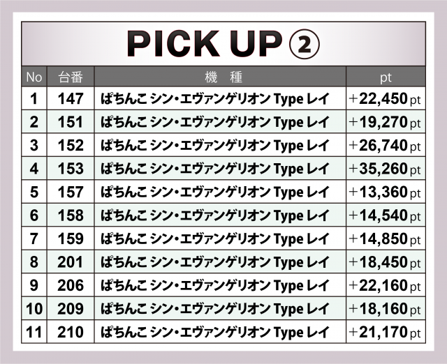 『ぱちんこ シン・エヴァンゲリオン Type レイ』26台も『エヴァ15』に勝るとも劣らない。こちらは15台と全体の6割弱が勝利に成功し、+1万を超えたのは11台。153番台の+3万5千超を最高値に+2万超が4台と、こちらのシマでも扇状に並べているドル箱の列が壮観だった。
