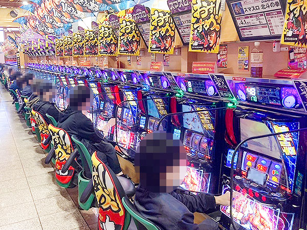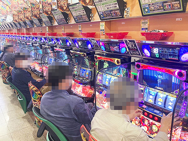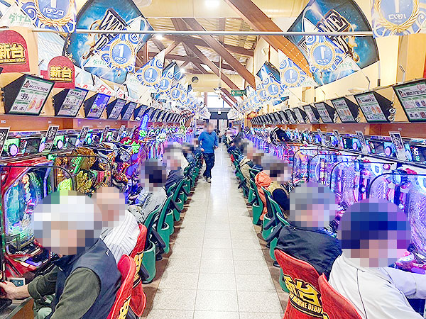 取材時は多くのプレイヤーが来店。パチンコ・パチスロともに、様々な機種が支持を得ていた。