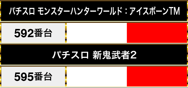 1日を通したデータをみると、『パチスロ モンスターハンターワールド:アイスボーンTM』の592番台や『パチスロ 新鬼武者2』の595番台がプラスptを記録。