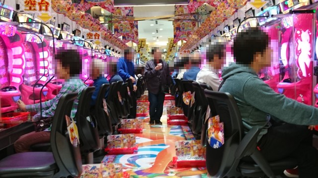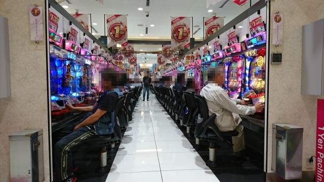 更に、1円パチンコのコーナーでは人気の「CRA牙狼金色になれ~ザルバとの契約~」や「CR逆転裁伴99.9ver.」などが勢ぞろいし、多くのプレイヤーが遊技を楽しんでいた。年配のプレイヤーの姿が多く、シマ一帯は穏やかな雰囲気に包まれていた。