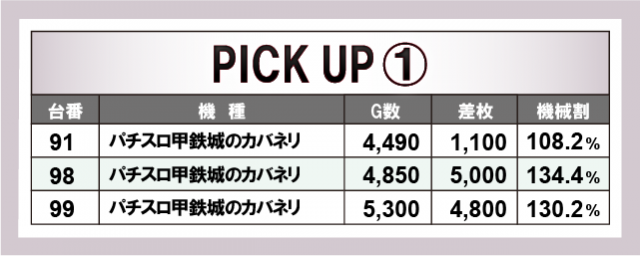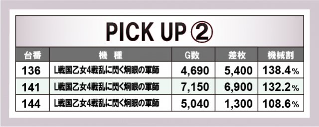 続いては、当日とくに盛り上がっていた2機種を紹介。まず「パチスロ甲鉄城のカバネリ」は、98番台の+5,000枚を筆頭に、ピックアップ3台の平均差枚は+3,633枚の好結果をマーク!次いで「L戦国乙女4戦乱に閃く炯眼の軍師」は、ピックアップ3台の平均差枚+4,533枚とこちらも素晴らしい結果を残していた!