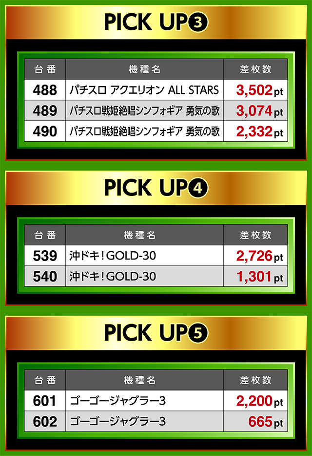 隣の「パチスロ戦姫絶唱シンフォギア 勇気の歌」にも優秀台が続き、489番台は3,074pt、490番台は2,332ptとなった。