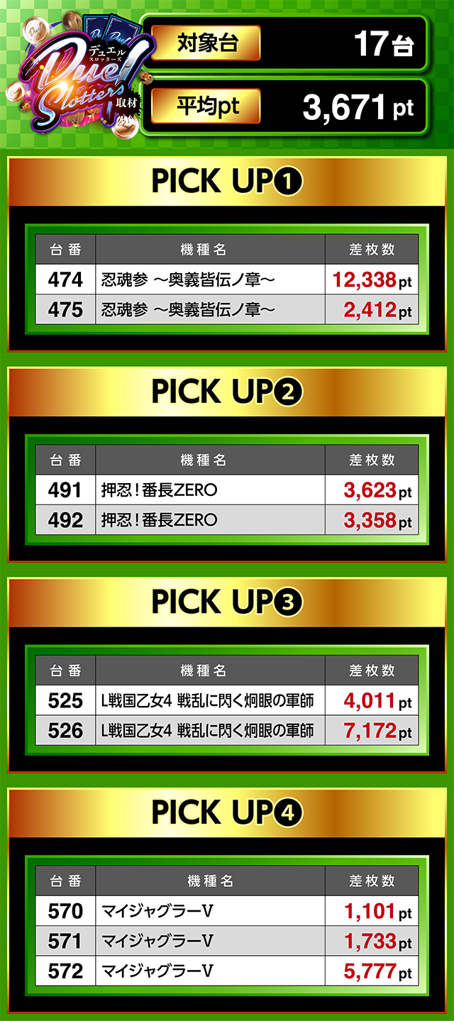 2台設置の「忍魂参 ~奥義皆伝ノ章~」は、474番台が12,338pt、475番台が2,412ptを記録。