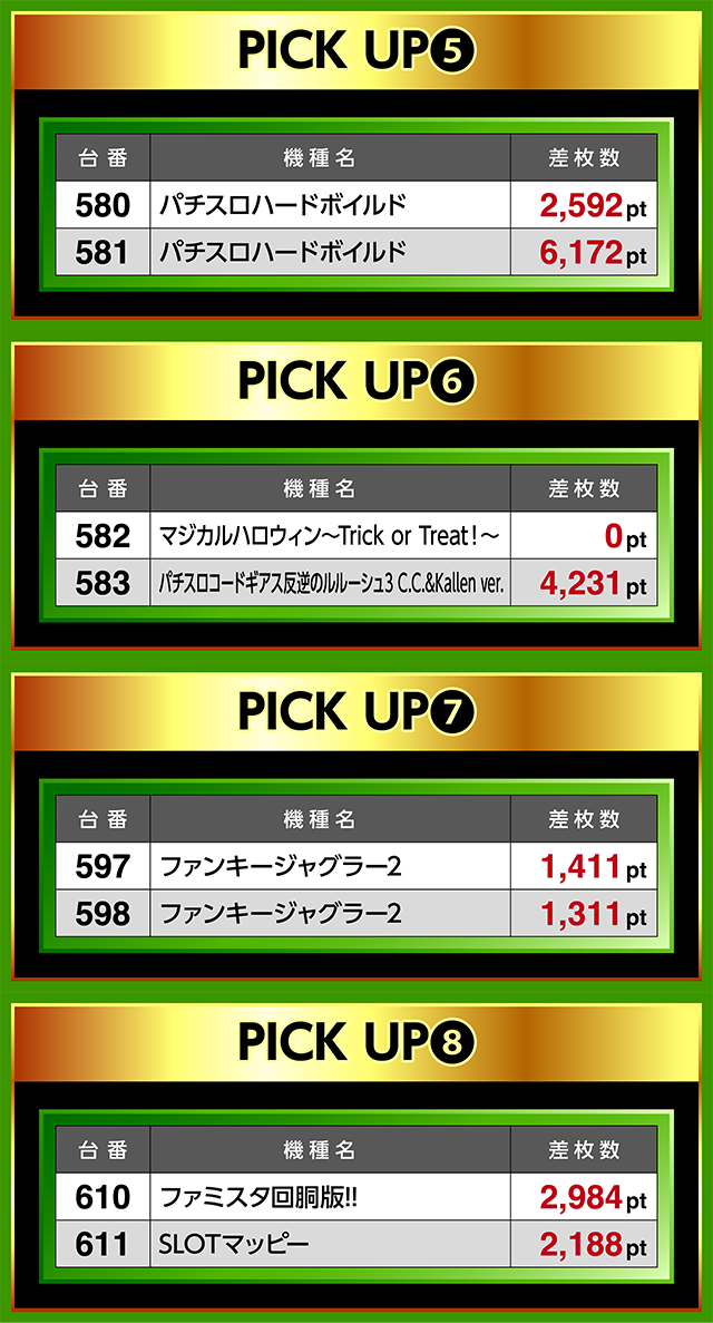 582番台の「マジカルハロウィン~Trick or Treat!~」と583番台の「パチスロコードギアス反逆のルルーシュ3 C.C.&Kallen ver.」も魅力的な並びであった。