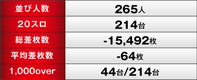 優秀台、注目台の活躍も見られたが、トータルの差枚数はわずかにプラスに届かず。それでも、1,000over台は44台/214台を記録しており、全体的な感触は悪くなかった。次回こそ、リアルな勝利を手にしようではないか!