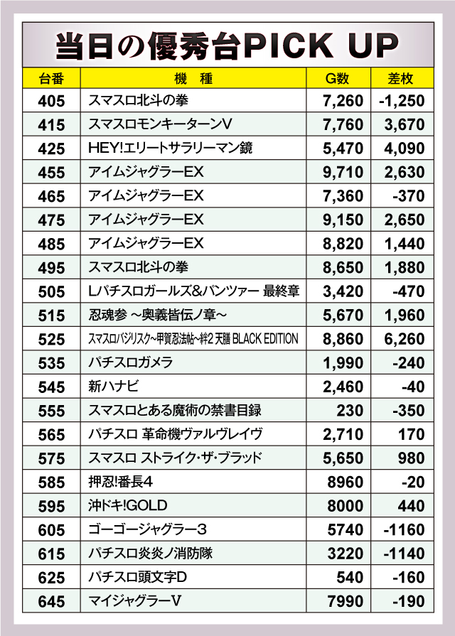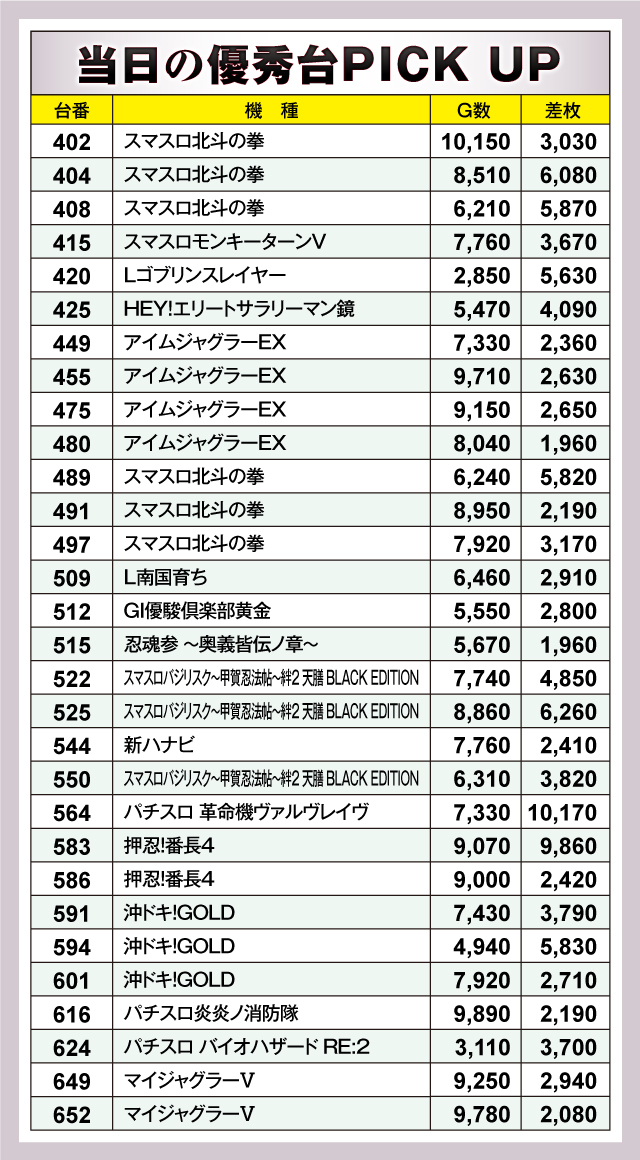 優秀台をチェックすると、+10,170枚の大台を突破した『パチスロ 革命機ヴァルヴレイヴ』の564番台にまず目が行く。スマスロの先駆けとしてデビュー以来、変わらぬパワーを見せてくれている。惜しくも大台には届かなかったが+9,860枚を記録したのが『押忍!番長4』583番台。デビューしたばかりの新鋭にしてこの春の大本命機がいきなり結果を出した。この2トップに続いたのが、+6,260枚を記録した『スマスロバジリスク~甲賀忍法帖~絆2 天膳 BLACK EDITION』の525番台。安定の出玉力はさすが。『スマスロ北斗の拳』も負けてはいない。404番台が+6,080枚、408番台が+5,870枚、489番台が+5,820枚をマークしており、あいかわらずの実力をアピールしている。その他、『沖ドキ!GOLD』の594番台が+5,830枚、『Lゴブリンスレイヤー』の420番台が+5,630枚と、+5,000枚オーバーを記録している。
