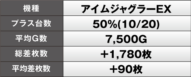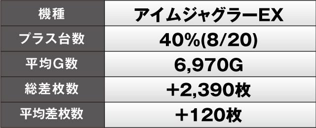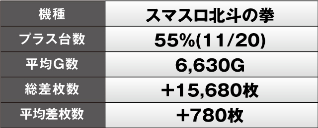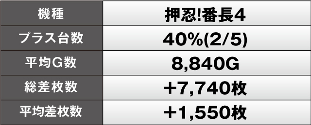 『スマスロ北斗の拳』は勝率50%オーバーを記録。平均差枚数も+780枚と安定感のあるところを見せた。『アイムジャグラーEX』は2シマともにプラス差枚を記録。トータルでも40台中18台がプラスと上々の成績だ。期待のニューフェイス『押忍!番長4』は、プラス台数こそ5台中2台だが、平均差枚数は+1.550枚とかなり優秀だった。今後の活躍に大いに期待できそうだ。