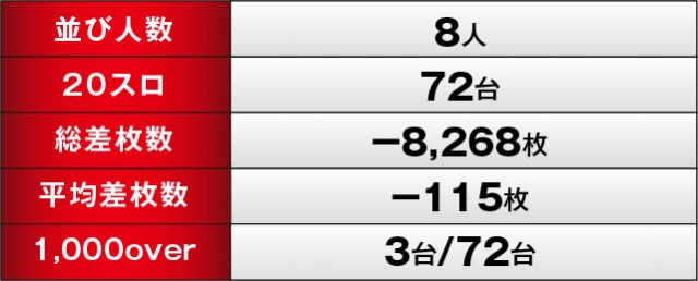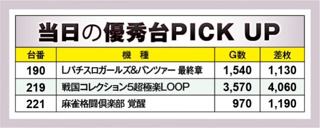 優秀台が3台と寂しい内容ではあるが、『戦国コレクション5超極楽LOOP』219番台+4,060枚と孤軍奮闘の活躍を見せた。他2機種も少ない回転数ながら1,000枚OVERを達成しており、大敗を喫することなく1日を終えたのは幸いと言えるだろう。ただ店内にはポテンシャルを秘めた台が存在していたかもしれない。ファン一人ひとりが自信を持ってレバーを叩く必要があり、そのためにも情報をしっかりと収集することが求められる。