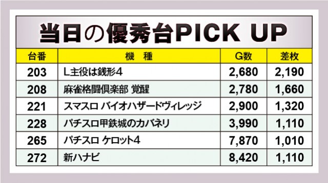 当日の優秀台は上表の通りで、少々物足りないと感じるかもしれない。しかし『パチスロ ケロット4』『新ハナビ』の2機種は高い回転数を記録しており、コンスタントなボーナス当選を果たしていた。ここまでレバーに力が入っていたのは、間違いなく相応の手ごたえがあったためだろう。そして『L主役は銭形4』『パチスロ鋼鉄城のカバネリ』も人気機種として活躍し、名を連ねているのも見逃せないばかりだ。