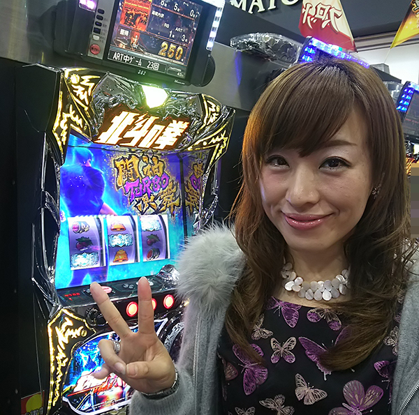 宇都慶子さんが笑みを浮かべて「パチスロ北斗の拳 修羅の国篇」を楽しんでおり、ホール内の雰囲気をより華やかなものにしていた。
