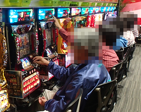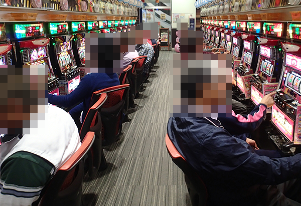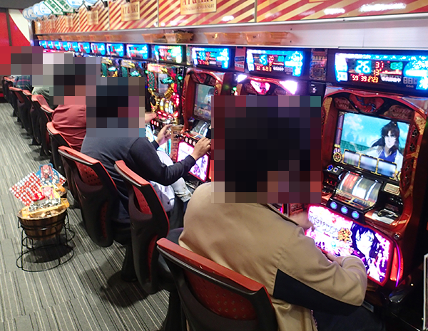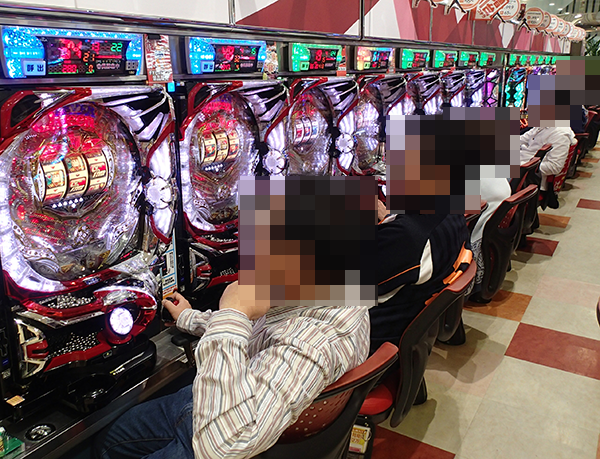 夕方ごろの20円パチスロをみると、ジャグラーシリーズが大にぎわい。笑顔で遊技をおこなっているプレイヤーの姿が目立っており、シマ全体が明るい雰囲気に包まれていた。