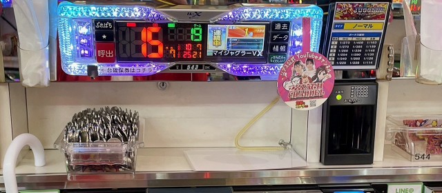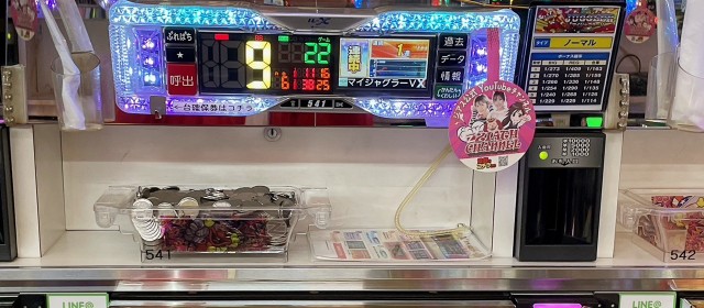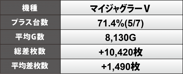 『マイジャグラーⅤ』7台ではプラス台の割合が7割超、そのトータルは+1万枚オーバー、こちらも平均で4桁のプラスを成し遂げ、シマのトップである543番台は+3千8百枚弱に至った。