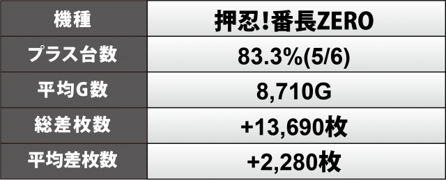 『押忍!番長ZERO』6台は勝率8割超&合計+1万4千枚弱、1台あたりの平均は+2千3百枚弱、+6千2百枚弱&+4千4百枚弱が1台ずつとハイクラスに終わった。