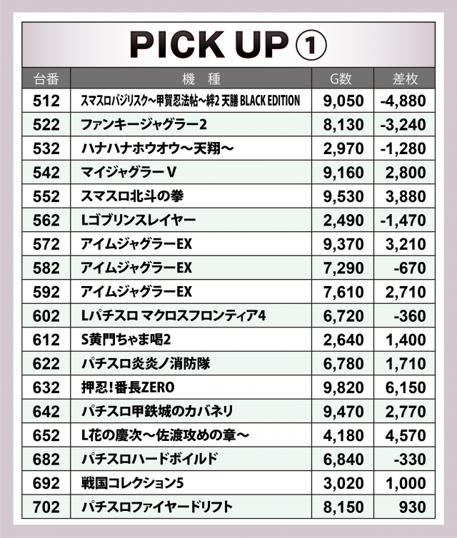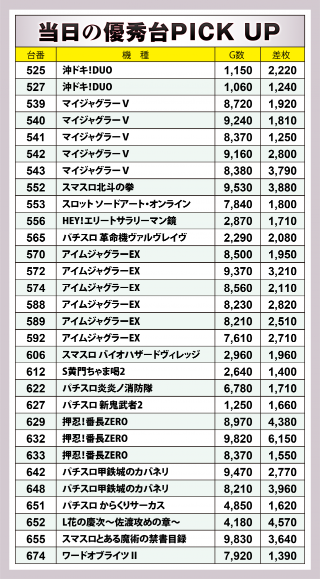 出ている台を逐一確認しているところ、22日の取材とあってか末尾2の台に多く高成績が見受けられた。以下のピックアップを参照願いたい。