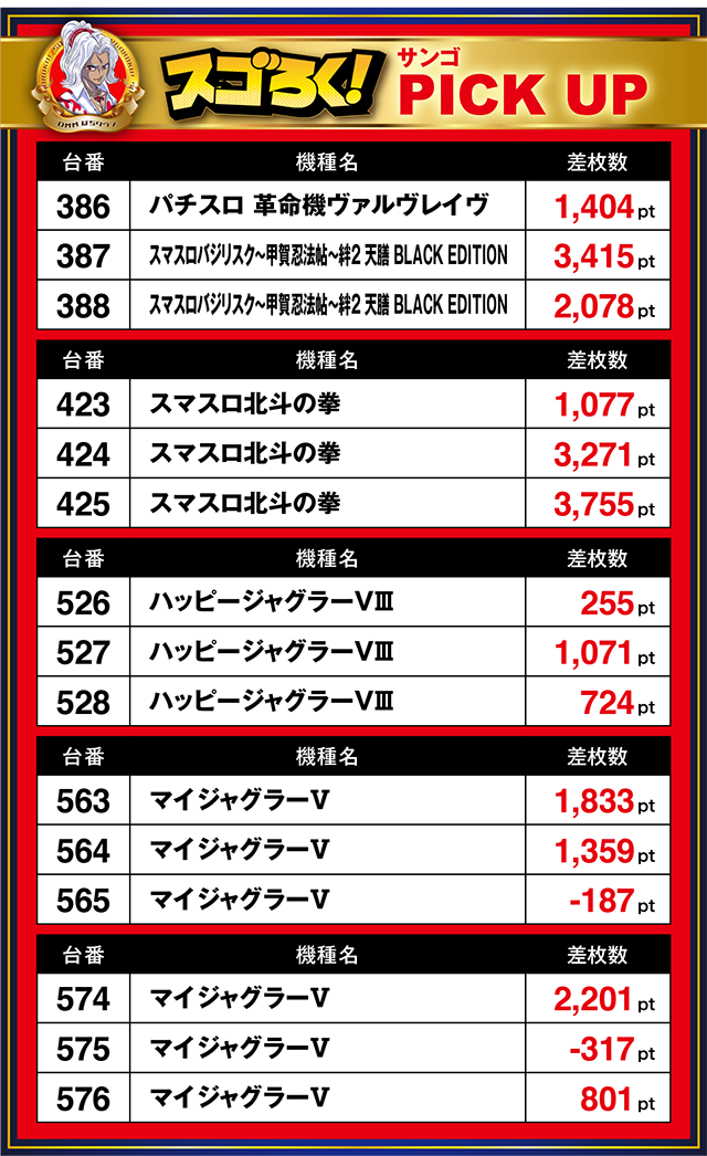 574番台から576番台までの3台も、2台がプラスとなり、2,000ptを超えた台があったぞ。