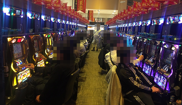 開店時の20円パチスロでは、「バジリスク~甲賀忍法帖~絆」や「沖ドキ!-30」など、満席となる機種が多数。