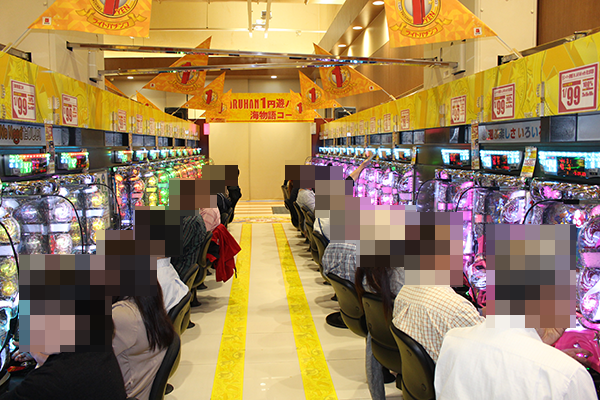 17時頃の4円パチンコでは、新台の「CRスーパー海物語IN沖縄4」が大盛況。笑顔で遊技をおこなっているプレイヤーが多くみられ、有意義な時間を過ごせていたようだ。