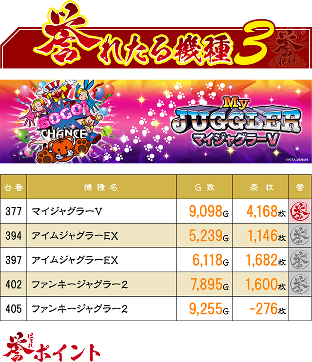 プラス台が多く目撃された『ジャグラー』コーナー。こちらのブロックでは誉マークが4台が生まれるなどまずまずの状況だった。『マイジャグラーⅤ』から4,000枚オーバーが誕生!