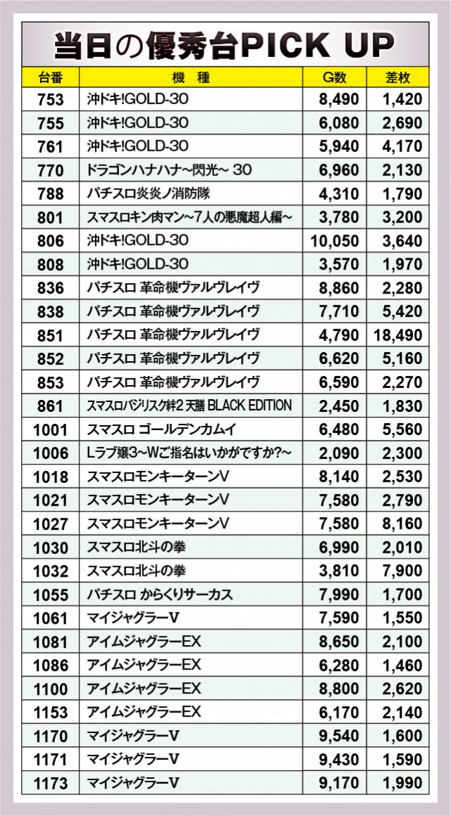 何よりも目を惹くのが『パチスロ 革命機ヴァルヴレイヴ』851番台+18,490枚であり、同機種はコンプリート達成という快挙を成し遂げた。ほかにも『スマスロモンキーターンV』1027番台+8,160枚や『スマスロ北斗の拳』1032番台+7,900枚といった熱気も見られ、これら機種が盛り上がりをリードしていたと言える。また高い回転数をマークした台も多く、『沖ドキ!GOLD-30』は万回転OVERを達成しているのも見逃せない。