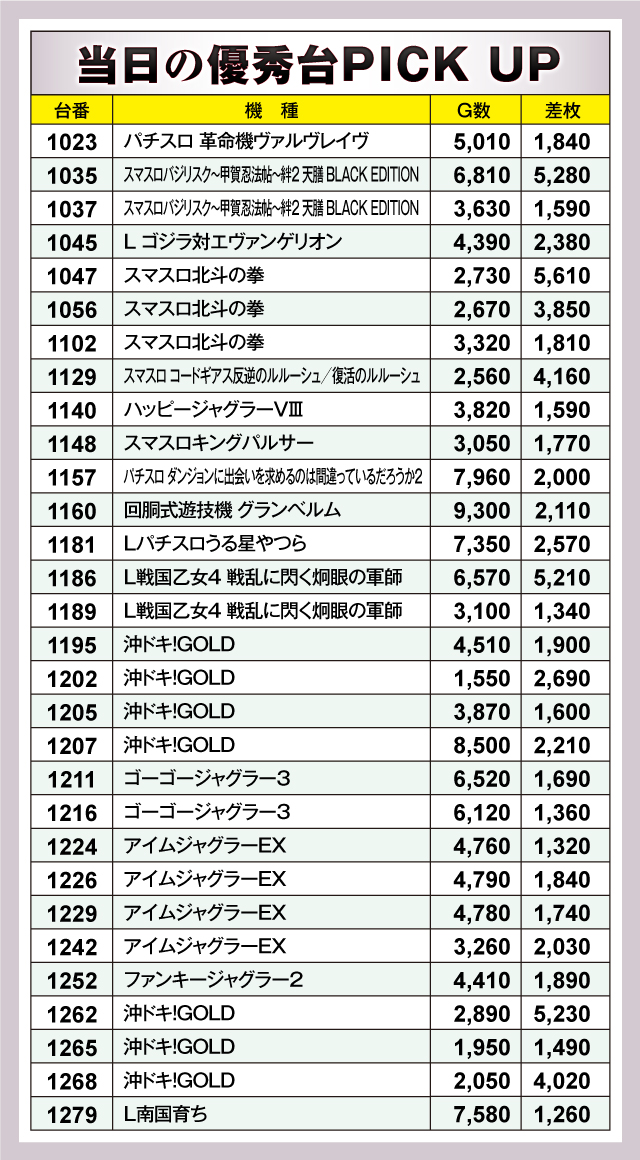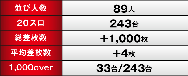 前回のような派手さは見られず、終わってみたらトータルの差枚数は+1,000枚だった。それでもプラスはプラス。1,000over台も33台/243台を記録しており、満足度の高い一日となった。次回も期待出ることは間違いない!