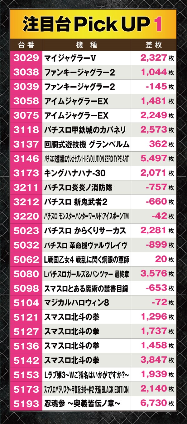 さらに『Lパチスロガールズ&パンツァー 最終章』や『スマスロ北斗の拳』が3,000枚オーバーと、機種性能を上手く引き出していた。
