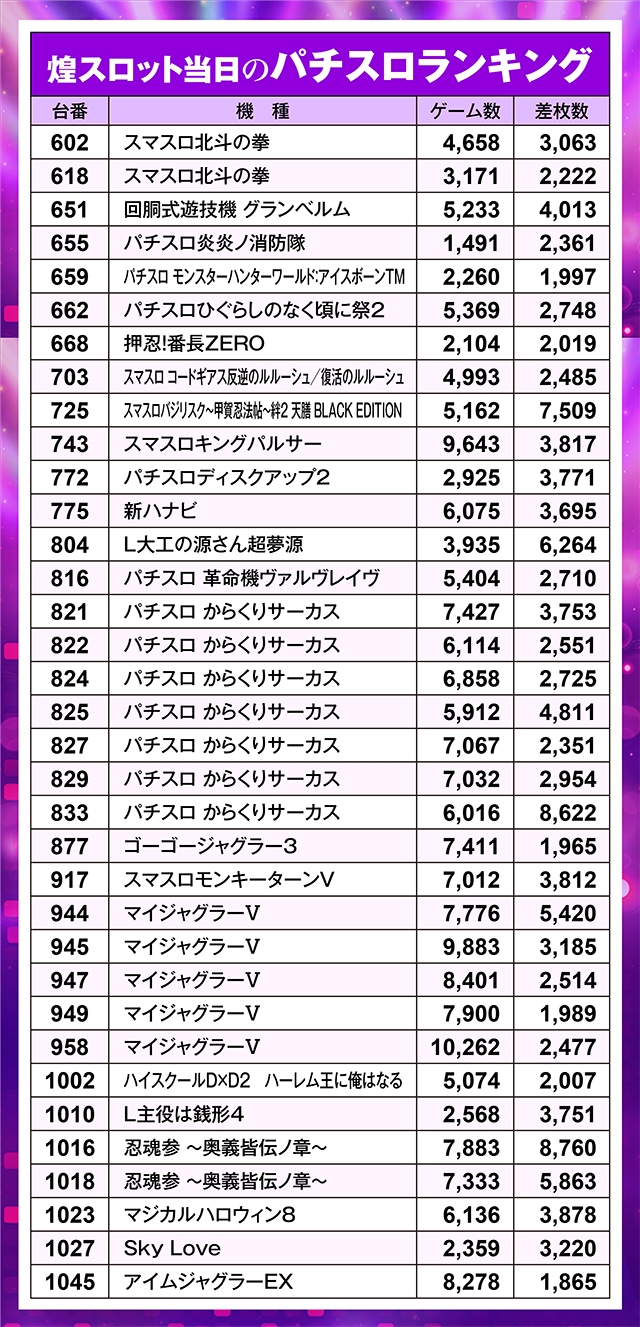 煌スロット当日のスロットランキング