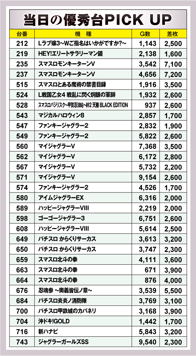 まずは優秀台30台の紹介から。30台のうち25台が+2,000枚オーバーで、+3,000枚オーバーは12/30台出現。それらのなかでもっとも優秀な成績を収めたのが、237番台の「スマスロモンキーターンV」で、差枚+7,200枚を獲得! またランクイン台を詳しく見てみると、スマスロを中心に人気機種が大賑わいで、その他ハイスペック機種に負けじとジャグラーシリーズが12台もランクインしていた!