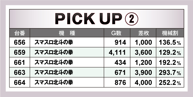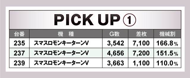 続いては、当日とくに賑わいを見せた2機種を紹介していこう。まず「スマスロモンキーターンV」は、優秀台の235番台を筆頭に好記録が連発で、ピックアップ3台の平均差枚は+5,133枚と当日トップクラスの好結果! そして「スマスロ北斗の拳」は、ピックアップ5台のうち3台が+3,000枚以上のプラスで、平均差枚+2,740枚とこちらも素晴らしい結果をマーク! これら2機種が当日の盛り上がりを牽引していたことは間違いなさそうだ!