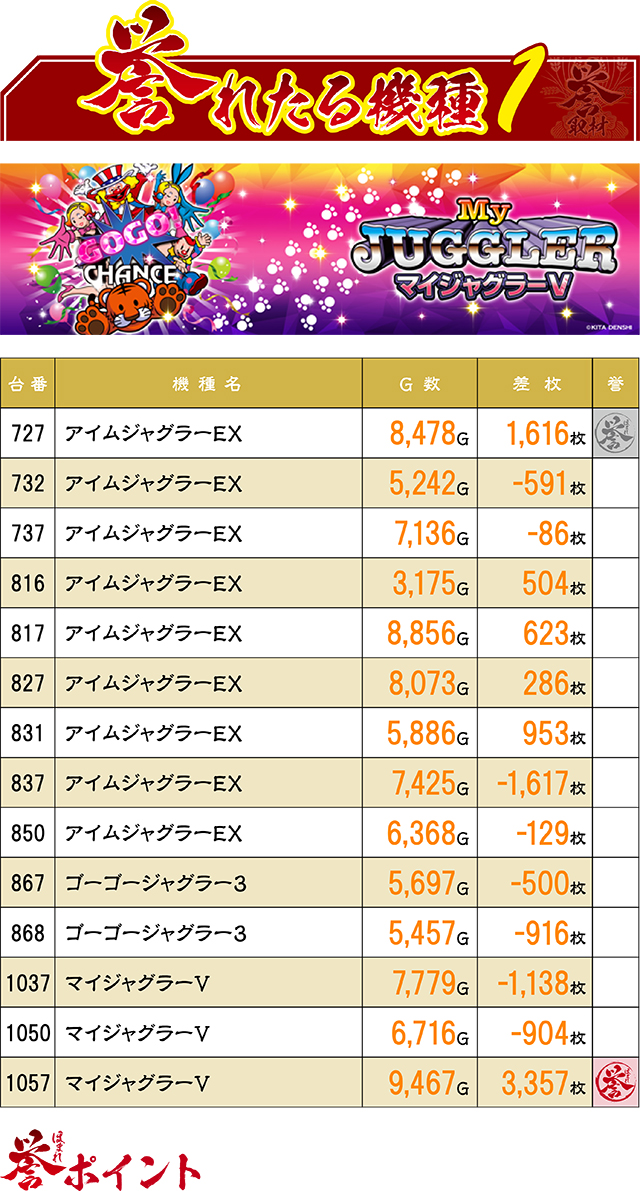 残念ながら『ジャグラー』シリーズのブロックでは、目の覚めるような記録は少なく、誉マーキングも2台に留まった。しかしプラス台の多さはさすが!