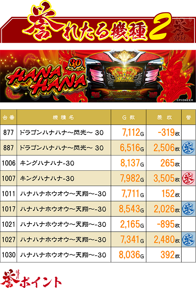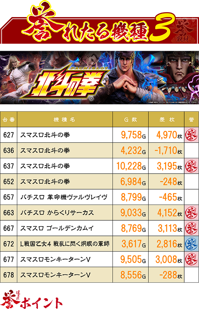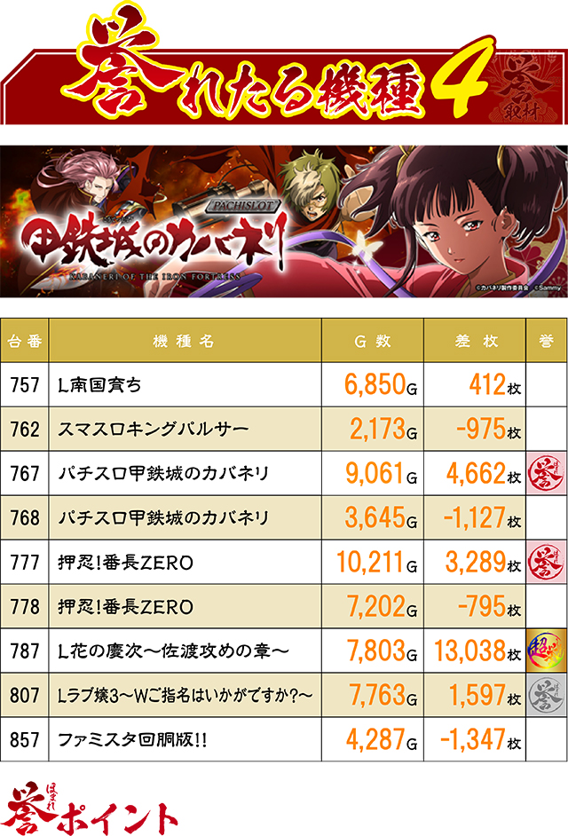 『パチスロ甲鉄城のカバネリ』『押忍!番長ZERO』『L花の慶次~佐渡攻めの章~』に誉マーク!このあたりの台はしっかり優秀台挙動が現れており、この結果にも納得である。