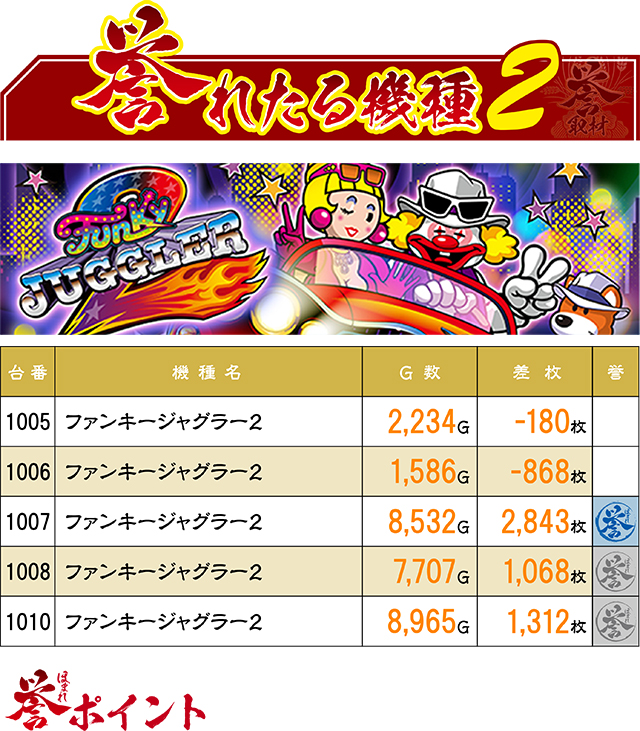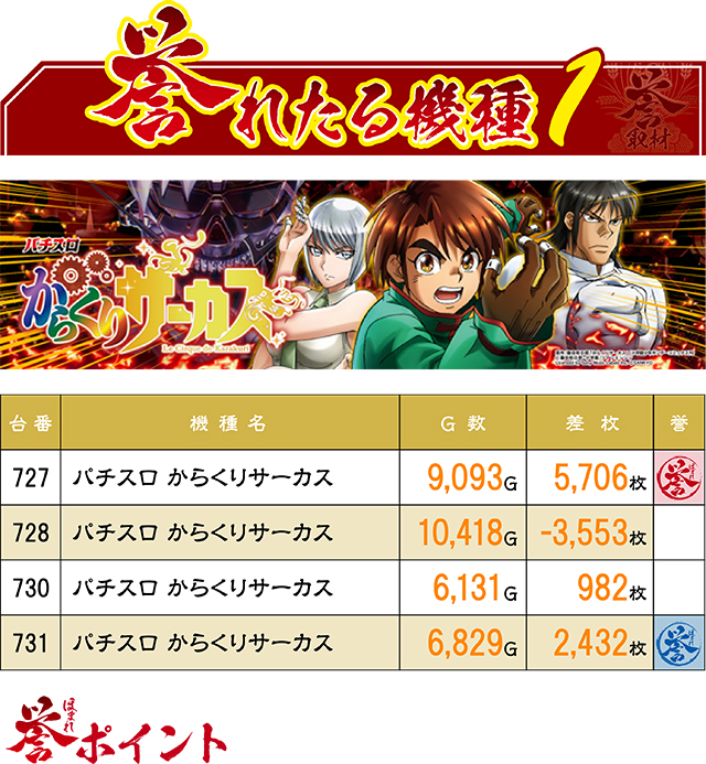今回も誉マークが多数出現!その数、実に42台であり、約4.7台に1台が誉マーク付きだったことになる。また『パチスロ からくりサーカス』と『ファンキージャグラー2』は機種単位で状況がよかったようで、全台系の可能性を十分に秘めているのではないだろうか。
