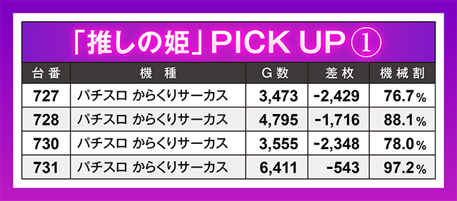 4台設置の『パチスロ からくりサーカス』は、残念ながら4台ともがマイナスに…。最も回された731番台が一番マイナス値が少なかった。ということは4台とももっと回されていたら…!?