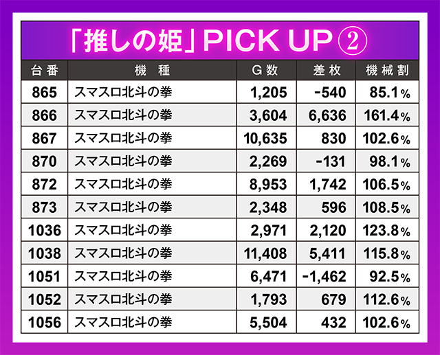 『スマスロ北斗の拳』からも数多くのプラス台が生まれていた。しかし総ゲーム数の少ない台もあり、そういった台はプラス差枚を伸ばし切れずに閉店を迎えてしまった模様。