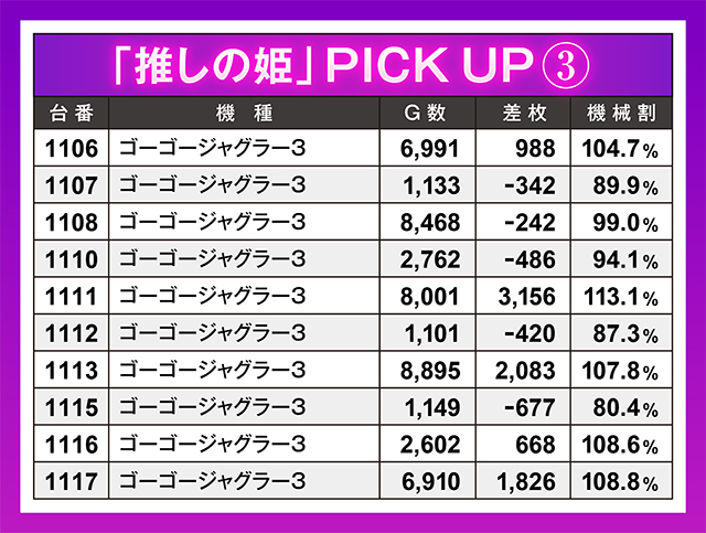 全10台設置の『ゴーゴージャグラー3』の勝率は5割。それでもこの10台の平均差枚は+655枚をマークし、十分すぎる内容となっていた。