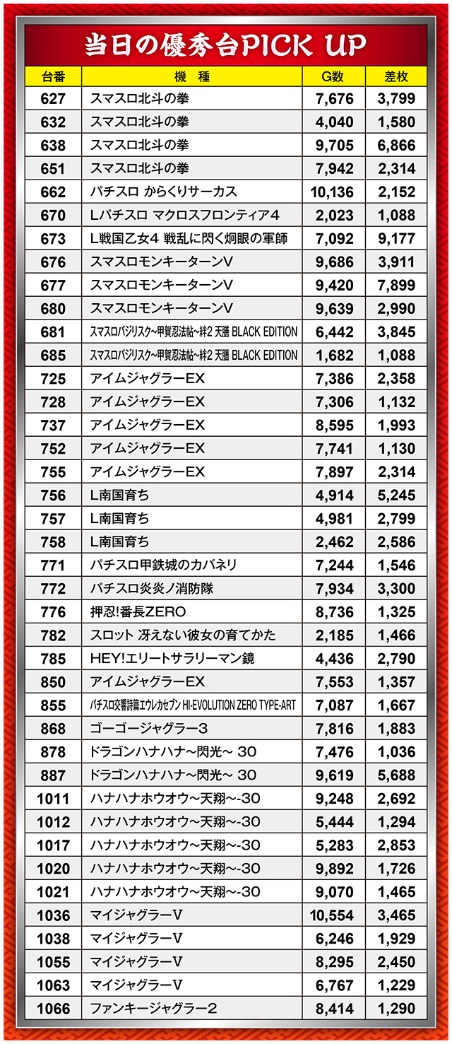 数多くのプラス台が誕生したこの日。5,000枚オーバー台も少なくなく、『スマスロモンキーターンV』と『L戦国乙女4 戦乱に閃く炯眼の軍師』からは7,000枚を上回る結果も生まれていた。さらには『ジャグラー』シリーズや『ハナハナ』シリーズにも優秀台が多く配置されていたのか、告知ランプを光らせまくり、プラっていた台が多数!