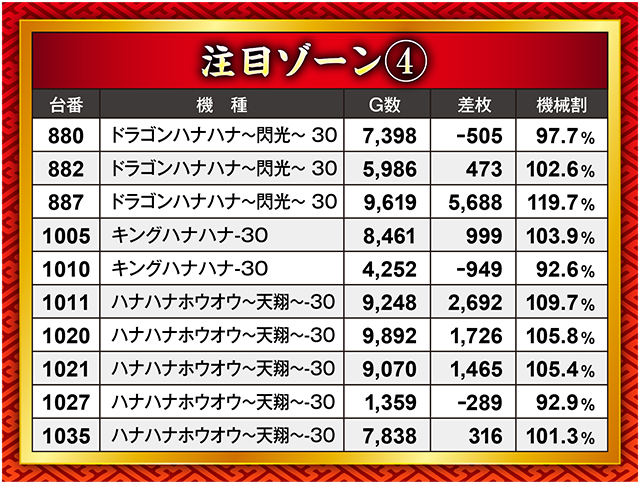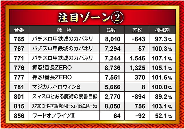 こちらのブロック、大きなマイナスがなかった反面、大きなプラス記録もなかった。結果だけ見ると優秀台など皆無のように思えるが、いくつかの台からは優秀台挙動を確認済みだ。