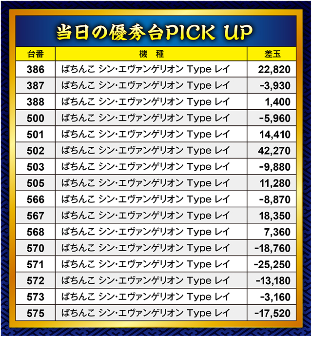 前回に引き続き、またしても『ぱちんこ シン・エヴァンゲリオン Type レイ』コーナーから大量差玉を確認!16台のトータル勝率も68.7%と極めて高く、マイナスで終わったのは5台のみ。かなりパワフルだったこのコーナー、最終的に9台が10,000玉超え、4台が30,000玉超えを達成ッ!