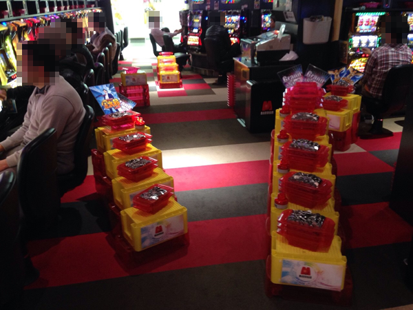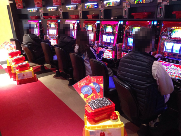 20円パチスロで盛り上がっていたのは沖スロコーナーやジャグラーシリーズ。沖スロコーナーには好調な台が多く、ボーナスの告知を表すランプの点灯に心の底から喜ぶプレイヤーが見られた。