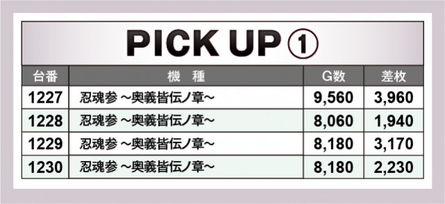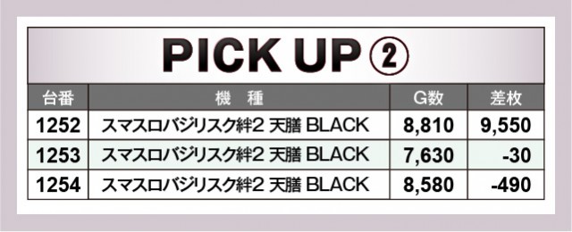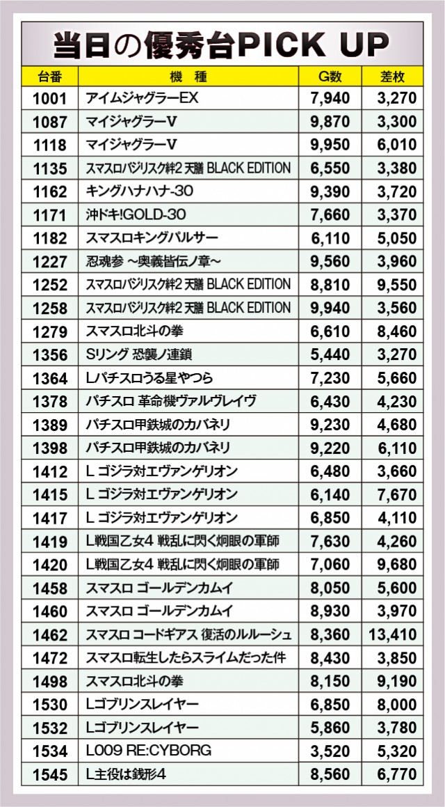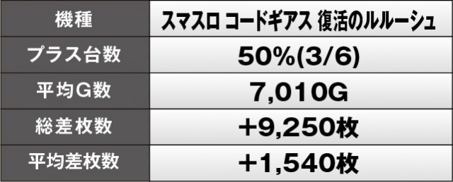 『スマスロ コードギアス反逆のルルーシュ/復活のルルーシュ』1462番台+13,410枚と万枚OVERが発生。さらには『スマスロバジリスク~甲賀忍法帖~絆2 天膳 BLACK EDITION』1252番台+9,550枚や『L戦国乙女4 戦乱に閃く炯眼の軍師』1252番台+9,680枚など、惜しくも万枚に届かなった台も見られる。全体的に高い回転数を記録しているため、誰もが大きな手応えを感じていたのではないだろうか。