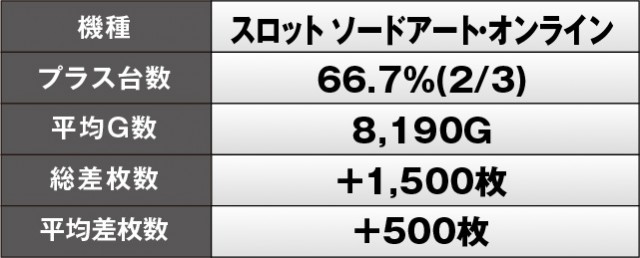 『スマスロ コードギアス反逆のルルーシュ/復活のルルーシュ』『キングハナハナ-30』『スロット ソードアート・オンライン』の3機種は、いずれも高い回転数をマーク。好感触を掴めたエリアとなっており、まとまった出玉を獲得している様子も印象的だ。腰を据えて遊戯できたファンは、間違いないなく有意義な時間を過ごしていたことだろう。