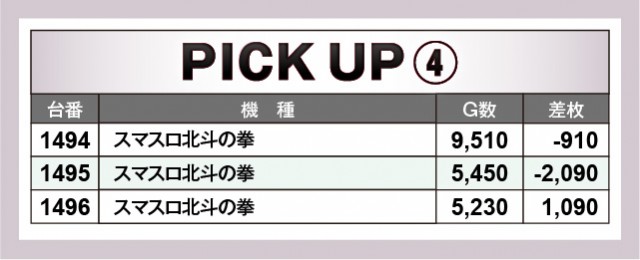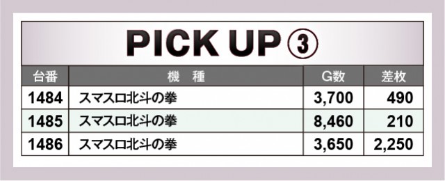 『忍魂参 ~奥義皆伝ノ章~』は閉店までじっくりと打ち込まれ、まとまった出玉を獲得していたのが印象に残る。『スマスロバジリスク~甲賀忍法帖~絆2 天膳 BLACK EDITION』からは1252番台+9,550枚と万枚未遂の熱量が放たれ、ファンは自然と力が入ったことだろう。また絶対的な存在である『スマスロ北斗の拳』では、2ヶ所の好況スポットが形成されていた。1484~1486番台・1494~1496番台の合計6台は明らかに好感触を掴んでいたエリアで、ファンは口角を緩めていたに違いない。