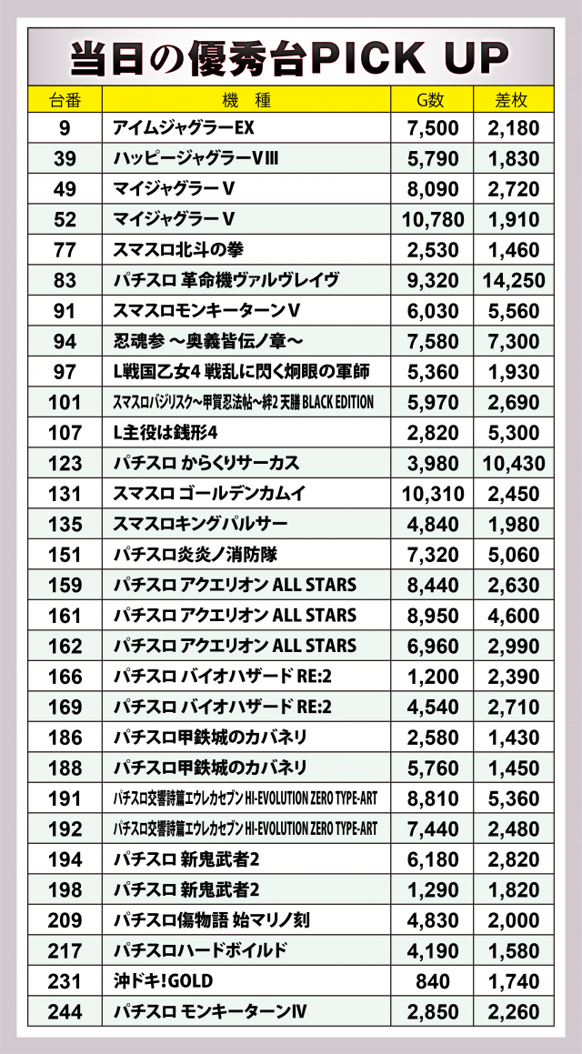 以下では、入手した出玉データから当日の優秀台をチェックしていこう。