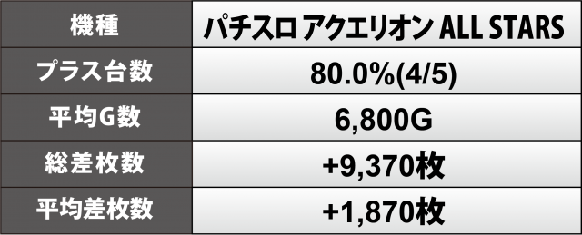 『パチスロ アクエリオン ALL STARS』5台では+4千6百枚超を筆頭に4台がプレイヤーの勝利となり、その合計は+9千4百枚弱となった。