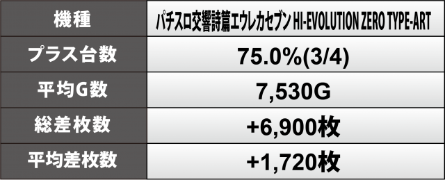 『パチスロ交響詩篇エウレカセブン HI-EVOLUTION ZERO TYPE-ART』は4分の3がプラスに成功、+5千4百枚弱をトップに合わせて+7千枚目前に迫った。またこちらの1台あたり平均も『アクエリオン ALL STARS』に匹敵するレベルとなった。