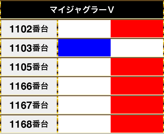 パチスロでは、『マイジャグラーⅤ』の1102番台から1105番台までに華やかな光景が広がっていた。