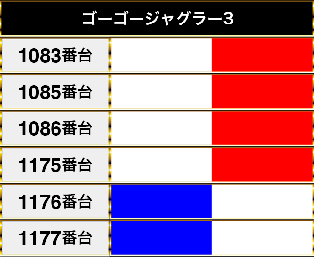 『ゴーゴージャグラー3』の1083番台から1086番台までも並んでプラスptを記録。